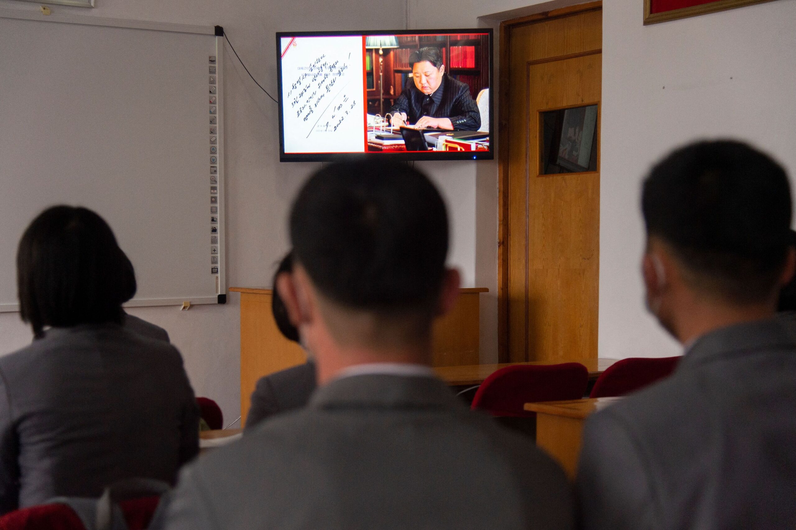 In this photo taken in Pyongyang on March 25, 2022, students of the Pyongyang Jang Chol Gu University of Commerce watch footage of North Korean Leader Kim Jong-Un along with news of the previous day’s launch of the Hwasong-17 missile — Pyongyang’s first ICBM test since 2017. (Photo by KIM Won Jin / AFP) (Photo by KIM WON JIN/AFP via Getty Images)